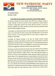In a release titled: “OUTCOME OF 2024 GENERAL ELECTIONS AND MATTERS ARISING” the New Patriotic Party (NPP), has expressed concern at the criminal and irresponsible activities of some leading members of the National Democratic Congress (NDC) as well as their supporters, to overturn the outcome of some parliamentary contests nationwide.