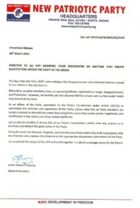 Signed by its General Secretary, Justin Kodua Frimpong, the release directed all NPP members “to immediately cease discussing Party issues that create unrest, negativism, and disaffection in the media and other related platforms.”